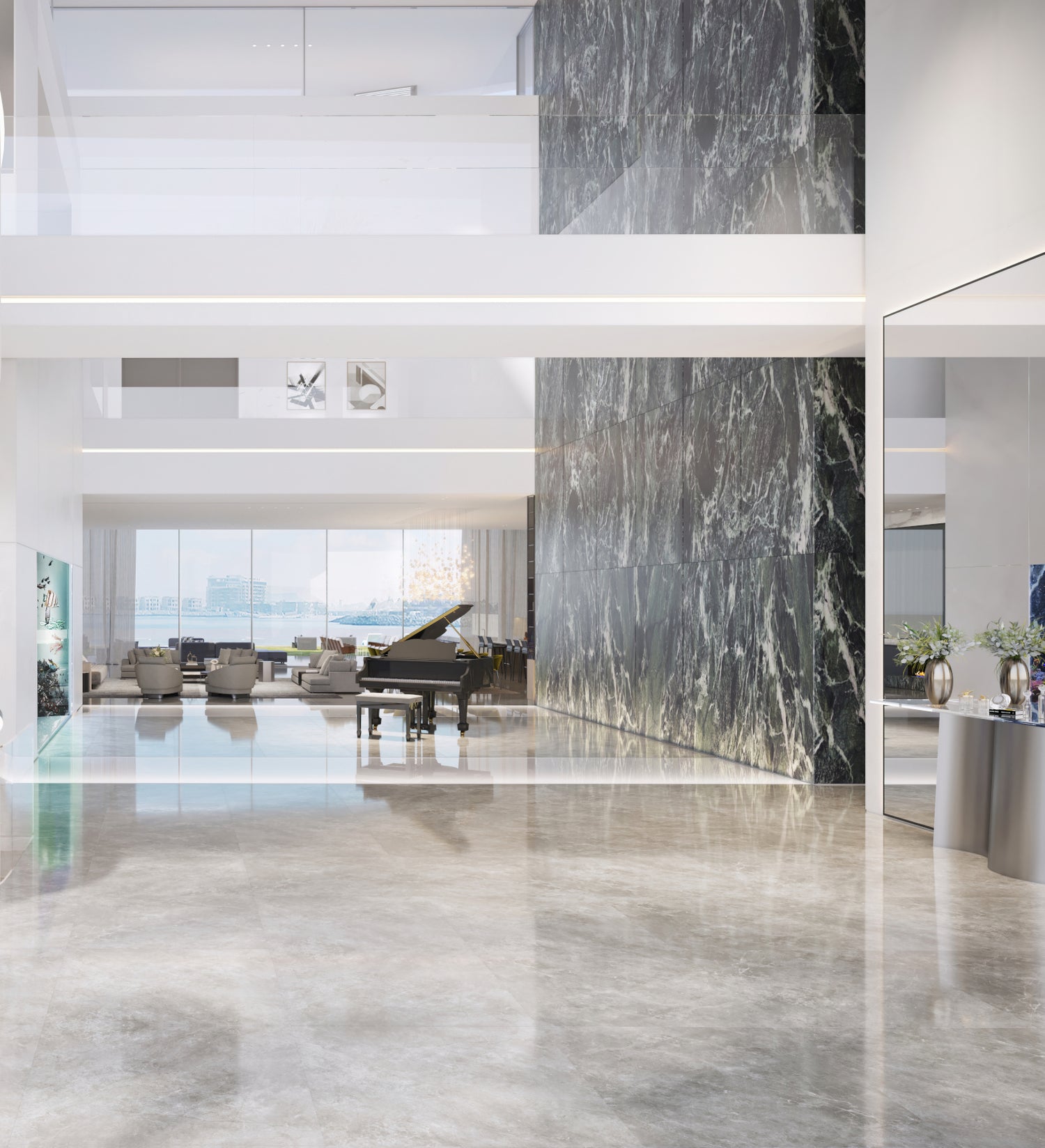 Kunst und Trends. Eine minimalistische, hell gefärbte, aber strukturierte Basispalette wird passend zur architektonischen Gestaltung verwendet und betont die doppelten Raumhöhen und beeindruckenden Volumina in der gesamten Villa. Diese Basisästhetik wird durch Texturen und Farben von besonderen Oberflächen, hochwertigen Armaturen und Ausstattungsmerkmalen verbessert, die eine harmonisierende und bereichernde sekundäre Palette zu den verwendeten Basismaterialien darstellen. Willkommen in einer Oase des modernen Luxus am Strand.